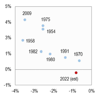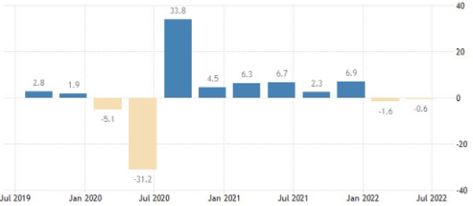 Diese Unterstützung seitens der FED fehlt nun aber. Die US-Wirtschaft befindet sich aktuell in einer Rezession (zwei Minusquartale hintereinander siehe Abb. 2), nicht stark, aber es ist eine Rezession.
