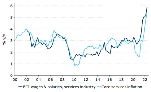 An der Abb. 5 kann man schön erkennen, dass die Löhne und Gehälter in der Serviceindustrie USA einen Gleichlauf mit der Kerninflation Dienstleistungen haben.