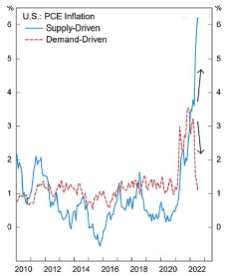 Es gibt vermehrt Anzeichen, dass die Inflation sich beruhigt. Aktuell fällt die Inflation welche durch Nachfrage ausgelöst wird in den USA bereits deutlich. Die Inflation welche durch Lieferengpässe ausgelöst wird (Corona und Ukrainekrieg) hingegen steigt immer noch deutlich (siehe Abb. 6). Hier geht man jedoch von einer Beruhigung aus.